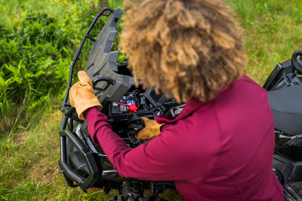 - 12 V støpsel, ladeport for arbeidslys, forhåndskablet for hånd- og tommelvarmere, PIN-aktivert sikkerhetssystem (P.A.S.S.), Bagasjebrettforlenger foran, lastekasse, A-armbeskyttere foran og bak